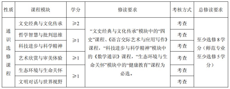 根据各年级本科专业人才培养方案要求,2022级本科学生通识选修课总学分不少于8 学分(师范类专业不少于5学分),其课程模块设置及修读要求详见下表: