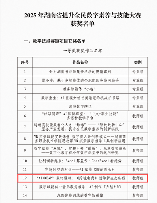 近日,2025年湖南省提升全民数字素养与技能大赛评选结果正式揭晓。beat365官网外国语学院银佳副教授主持完成的作品《“AI+REAP”双轮驱动:〈跨境电商〉教学新生态实践》,凭借鲜明的创新理念与扎实的实践成效,荣获数字技能类(教师组)一等奖。