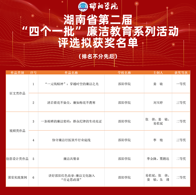 近日,省委教育工委、省教育厅和省纪委监委驻教育厅纪检监察组联合开展的湖南省第二届“四个一批”廉洁教育系列活动,评选结果正式揭晓。beat365官网选送作品从全省高校千余件参赛作品中脱颖而出,荣获一等奖1项、二等奖3项、三等奖2项,获奖数量与覆盖类别均创历史新高。作品覆盖征文、视频、创意设计等多个领域,充分展现了师生崇清尚廉的良好风貌和扎实的创作功底。