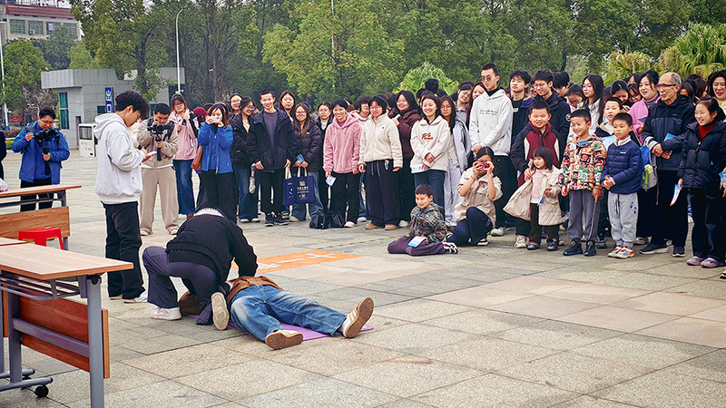 随后,普爱医学院“一站式”学生社区驿站的同学们带来精彩科普展演。学生自编自导的科普剧《熬夜把我熬废了》紧扣当代青年作息痛点,以贴近生活的剧情、生动形象的演绎,直观呈现熬夜带来的各类健康危害,让观众在沉浸式观看中认清不良作息的弊端,牢固树立健康生活意识。紧接着上演的原创《急救操》表演,将心肺复苏等专业急救知识拆解为简单易学的动作,表演者动作标准、节奏清晰,现场观众在轻松互动中快速掌握实用自救互救技能,兼具观赏性与实用性的节目赢得阵阵掌声。