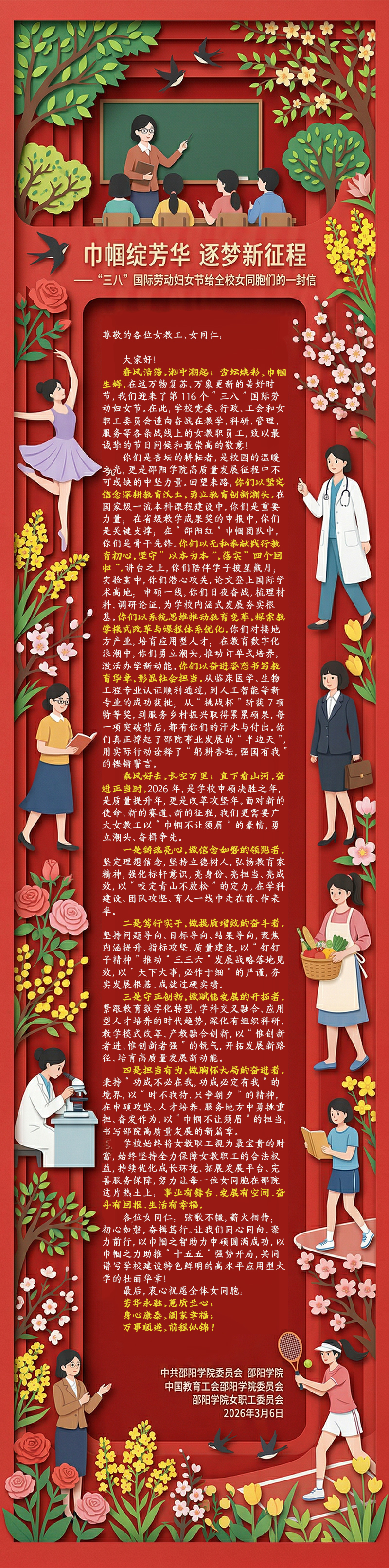 巾帼绽芳华 逐梦新征程 ——“三八”国际劳动妇女节给全校女同胞们的一封信